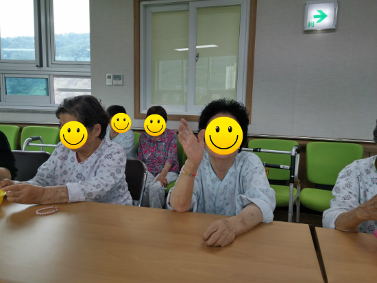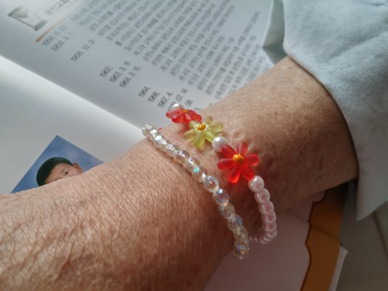 편마비가 있는 어르신 팔찌를 만들어 드리기 위해  열심히 핑크빛