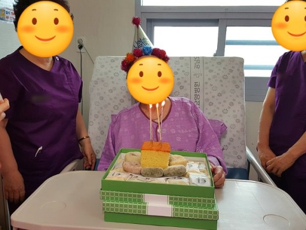 저희 강남요양병원에 입원중이신 어르신 가족분께서 생신 축하 떡 케이크를 보내주셨어요. 보내주신 케이크에 촛불도 꽂고 생신을 맞이하신 어르신 머리엔 고깔모자를 씌워드린 후 병동선생님들과 함께 생신축하송을 불러드렸어요. 갑작스럽 분위기에 당황하셨지만 매우 기뻐하셨어요. 진행하는 과정은 영상촬영 후 가족분에게 전송해 드렸어요.