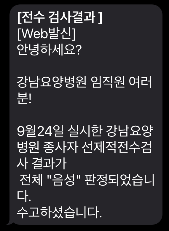 강남요양병원은 9월 24일 실시한 코로나 19 선제적 검사결과 전직원  "음성" 판정 되었습니다.